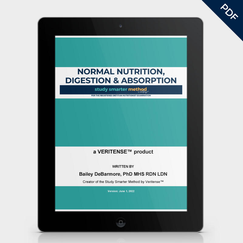 In-depth study guide that covers normal nutrition, digestion, and absorption for the RD exam - from macronutrients to micronutrients. Also covers the GI system, GI hormones, non-nutritive substances, and dietary supplements.