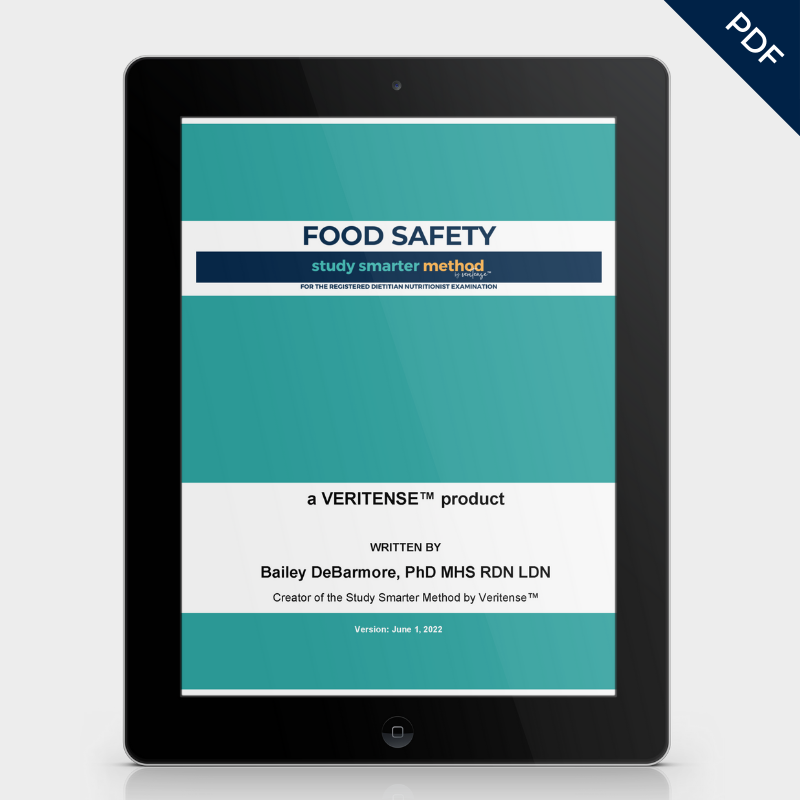 In-depth study guide that covers food safety for the RD exam - from principles of food safety, food safety management, sanitation, and foodborne pathogens.